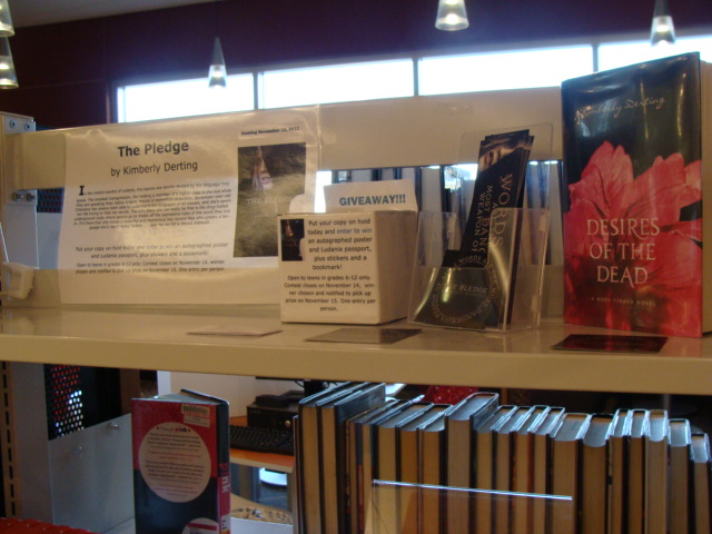 Let me just tell you that, wow, The Pledge Street Teamers pretty much blew me away with their enthusiasm and creativity! They enlisted their friends, family, adorable babies, and even a fabulous author (see below!) to help spread the word. There were tons of contests and giveaways for swag, and one street teamer even took her shiny copy of THE PLEDGE to a library that was...um...built in 117 A.D.!